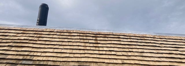 Today is a special shingle day. Thirty-five to fit, all lined up like soldiers in sweet chestnut armour. I manage the bottom three verge rows, and by the time I reach the final one, I discover it needs shaping — a kind of improvised triangle. Twice I descend and ascend to axe it to perfection (best done at ground level, where gravity is less opinionated).