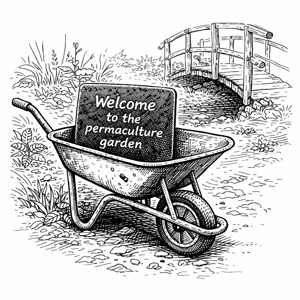 A third companion sits at the garden entrance — a small metal Freecycle barrow I adopted from Rattlesden. Its wheel hardly spins, its body is tiny, but with an old slate reading “Welcome” resting in it, it has become our quiet greeter.